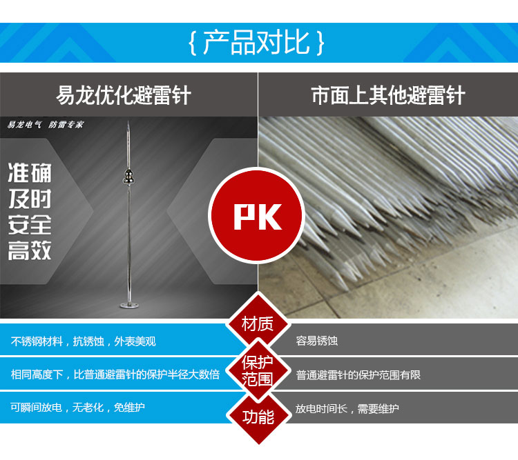 EPE系列提前放電避雷針(以下簡稱EPE避雷針)采用法國技術,符合法國NFC17-102標準。它由三種系統(大氣電力電容器、高壓脈沖發送系統、電流泄放系統)組成,具有雙重瞬間放電裝置,被多層的具有隔絕惡劣環境及水密性的材料所保護;無老化危險,免維護。在相同的安裝高度下,比普通瞬間避雷針的保護半徑大數倍,搶先放電時間為30μs~60μs,即優先引雷入地。