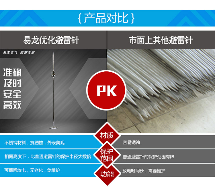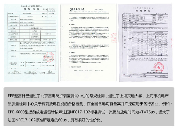 EPE系列提前放電避雷針(以下簡稱EPE避雷針)采用法國技術,符合法國NFC17-102標準。它由三種系統(大氣電力電容器、高壓脈沖發送系統、電流泄放系統)組成,具有雙重瞬間放電裝置,被多層的具有隔絕惡劣環境及水密性的材料所保護;無老化危險,免維護。在相同的安裝高度下,比普通瞬間避雷針的保護半徑大數倍,搶先放電時間為30μs~60μs,即優先引雷入地。