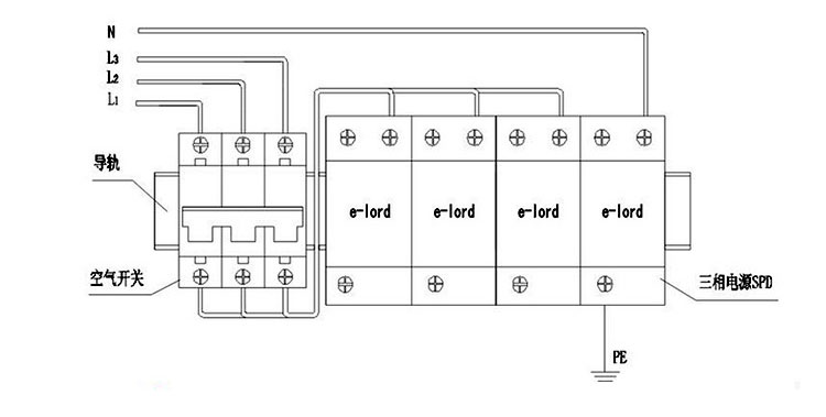 1. 已有可靠接地系統,在配電柜(避雷器安裝處)的接地樁 (條)上進行接地電阻的測定,電阻應符合相關規范要求。(或 滿足國家、部級標準)。 2. 配電柜中應留有安裝避雷器的空間,水平寬度為18×4(72) mm,上下寬度為大于150mm(考慮接線的方便),前后為大于 100mm,同時應有長為大于72mm的Ω型導軌,以固定避雷器。 3. 配套的配電柜應滿足國家相關產品標準。 注:L為電源相線;N為電源零線;PE為地線。 1. 相線用6-25mm2紅色/綠色/黃色導線連接; 零線用6-25mm2黑色導線連接; 地線用16-35mm2黃綠色導線連接。 2. 為防止短路,在避雷器的上端應安裝相應的,曲線C的空氣開 關。 | 應檢查空氣開關已經合閘導通,以保證避雷器處于運行狀態; 本產品只適用于室內使用; 不要在雷雨天安裝。 |
